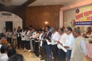 मनेन्द्रगढ़। एमसीबी जिला प्रेस क्लब द्वारा वर्ष 2026 के लिये द्वितीय शपथ ग्रहण समारोह रविवार शाम मनेन्द्रगढ़ स्थित होटल हसदेव इन में गरिमामय वातावरण में आयोजित किया गया। समारोह में छत्तीसगढ़ के स्वास्थ्य मंत्री और क्षेत्रीय विधायक श्यामबिहारी जायसवाल मुख्य अतिथि के रूप में शामिल हुए। कार्यक्रम में प्रधान न्यायाधीश परिवार न्यायालय एमसीबी राजेंद्र कुमार वर्मा, सत्र न्यायाधीश विवेक तिवारी एवं मुख्य न्यायिक मजिस्ट्रेट लोकेश कुमार ने शपथ अधिकारी के रूप में भाग लिया।